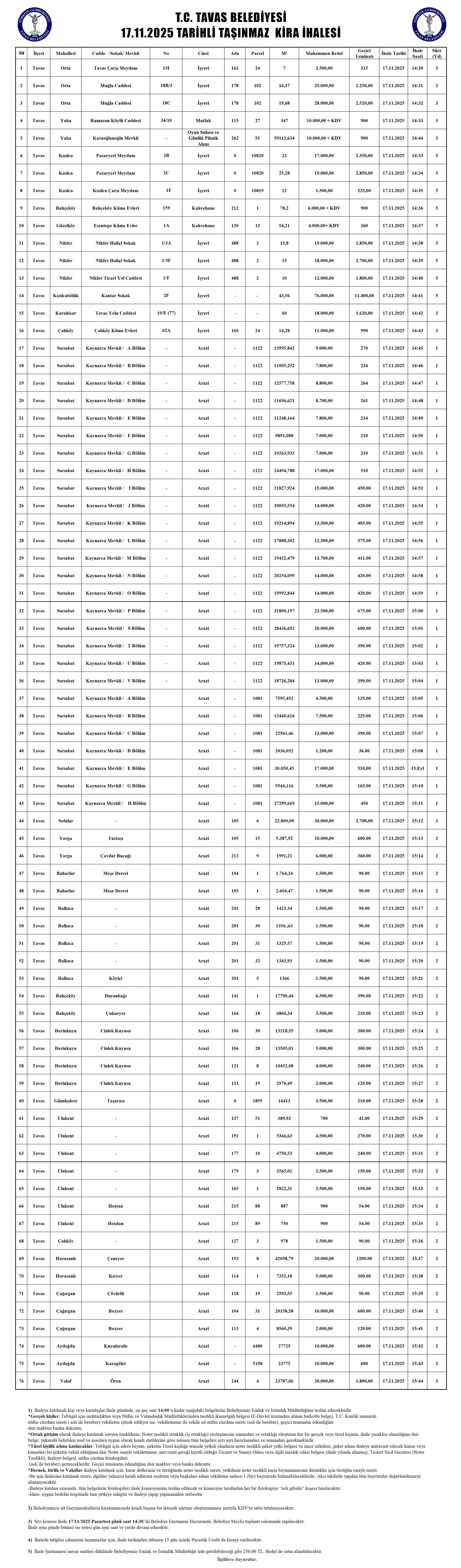 17.11.2025 TARİHLİ İŞYERİ, ARAZİ KİRA İHALESİ