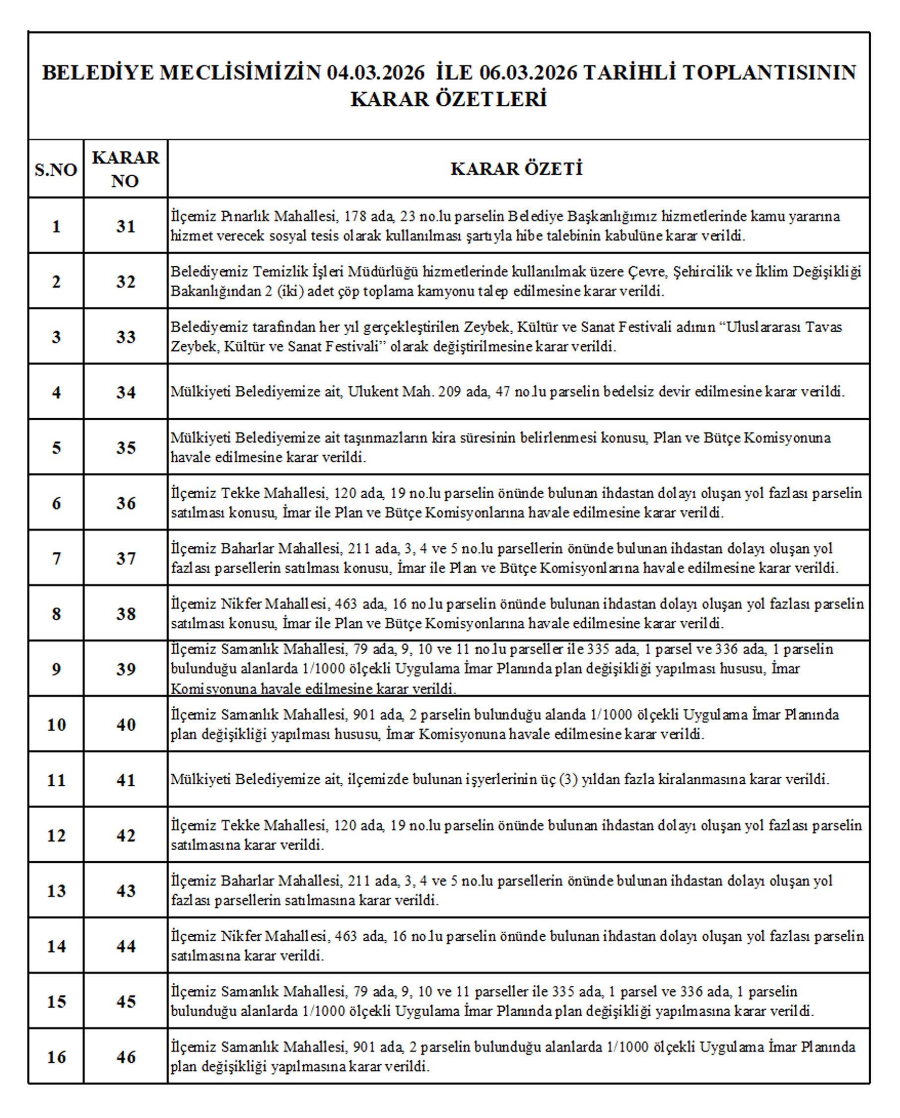 BELEDİYE MECLİSİMİZİN 04.03.2026-06.03.2026 TARİHLİ 2026-03 NOLU TOPLANTISININ KARAR ÖZETLERİ VE İMAR İLE PLAN VE BÜTÇE KOMİSYON RAPORU