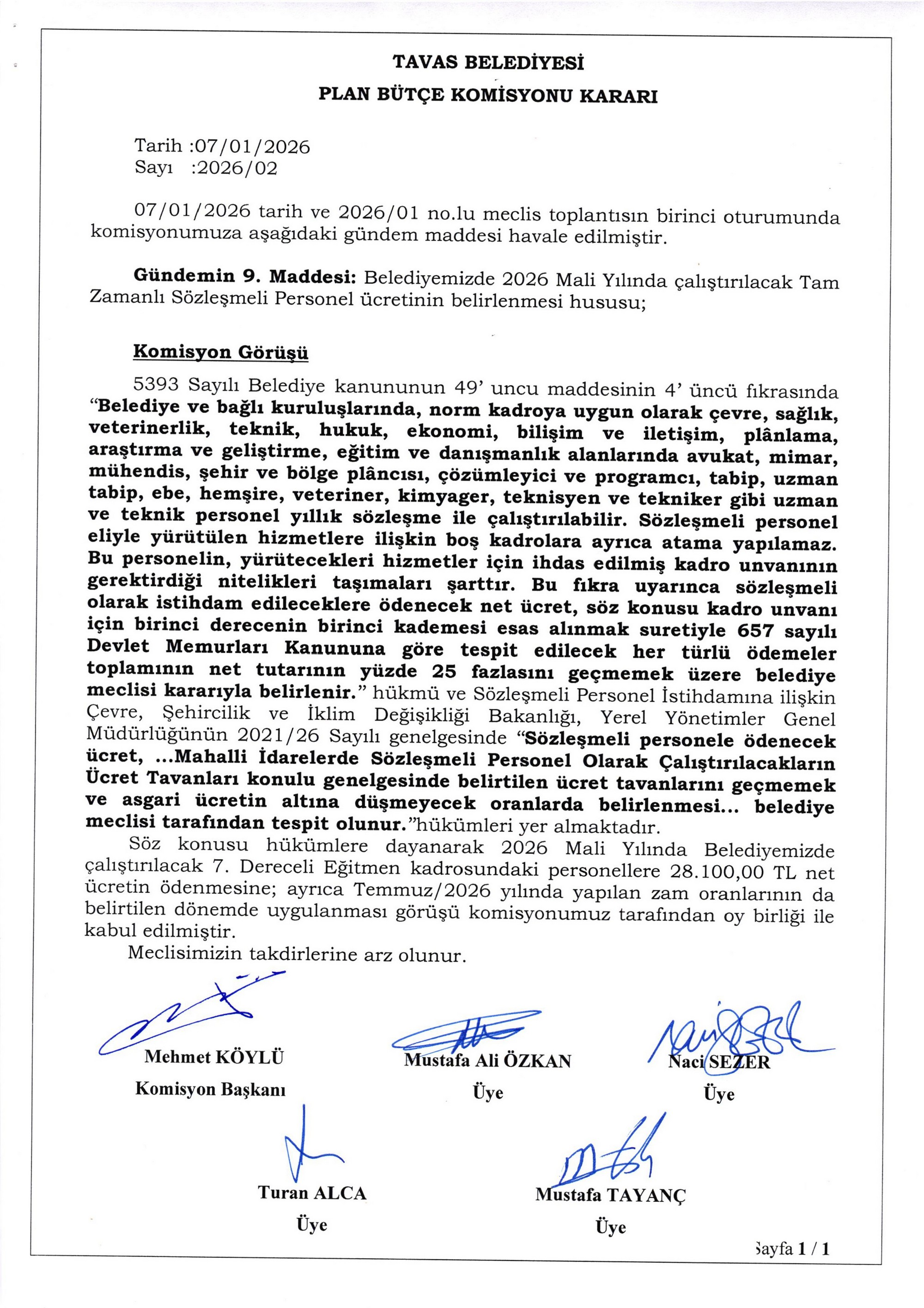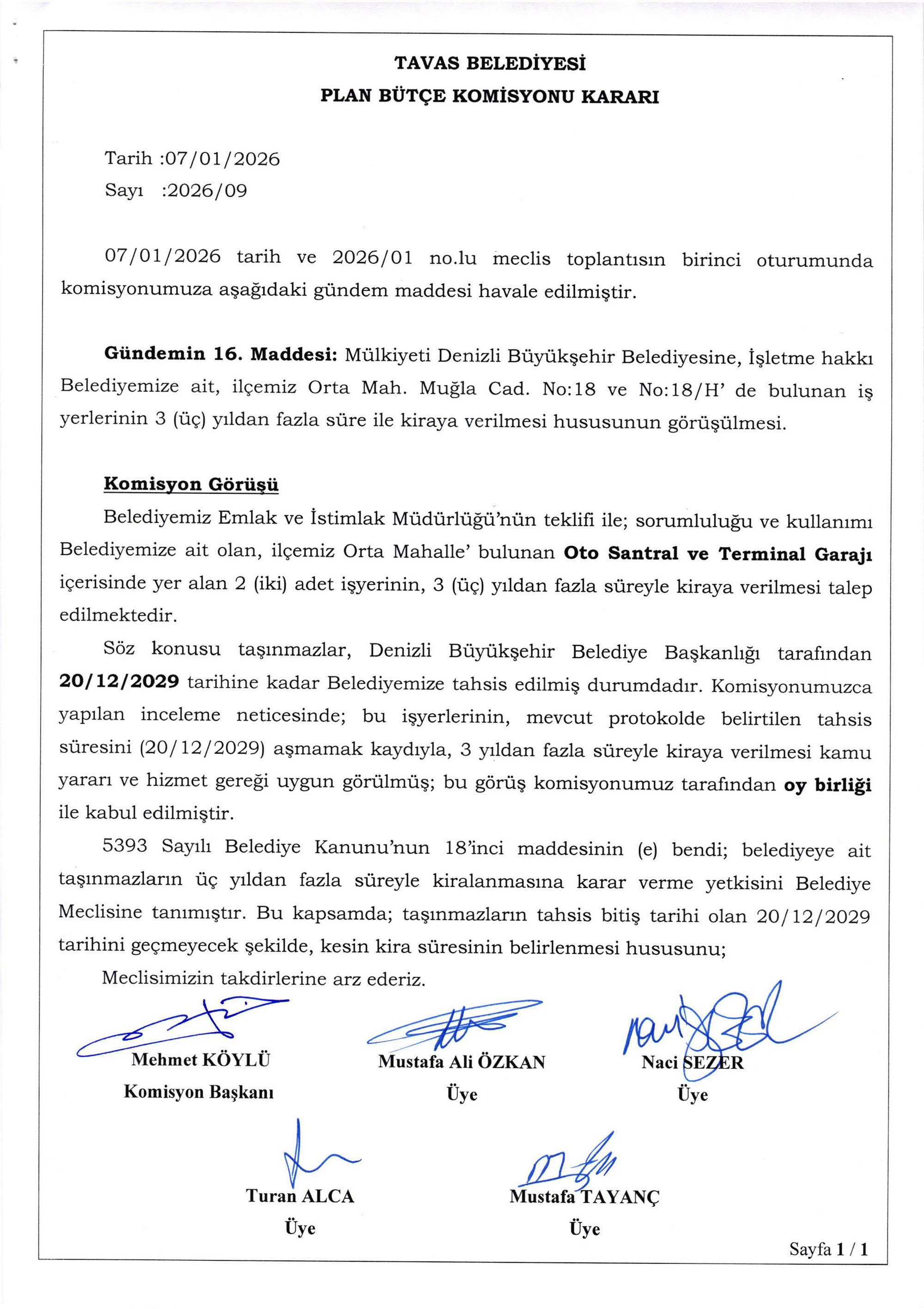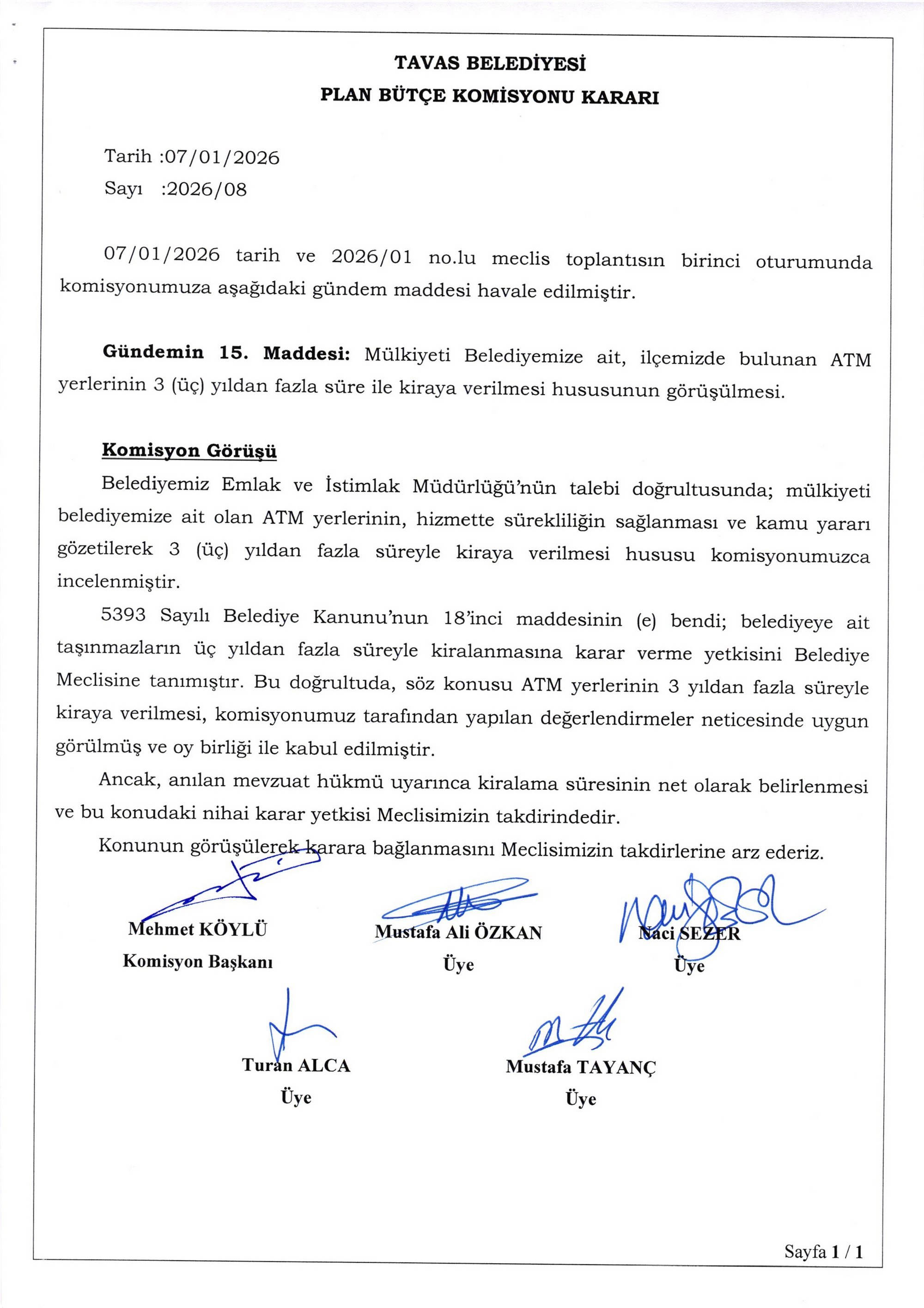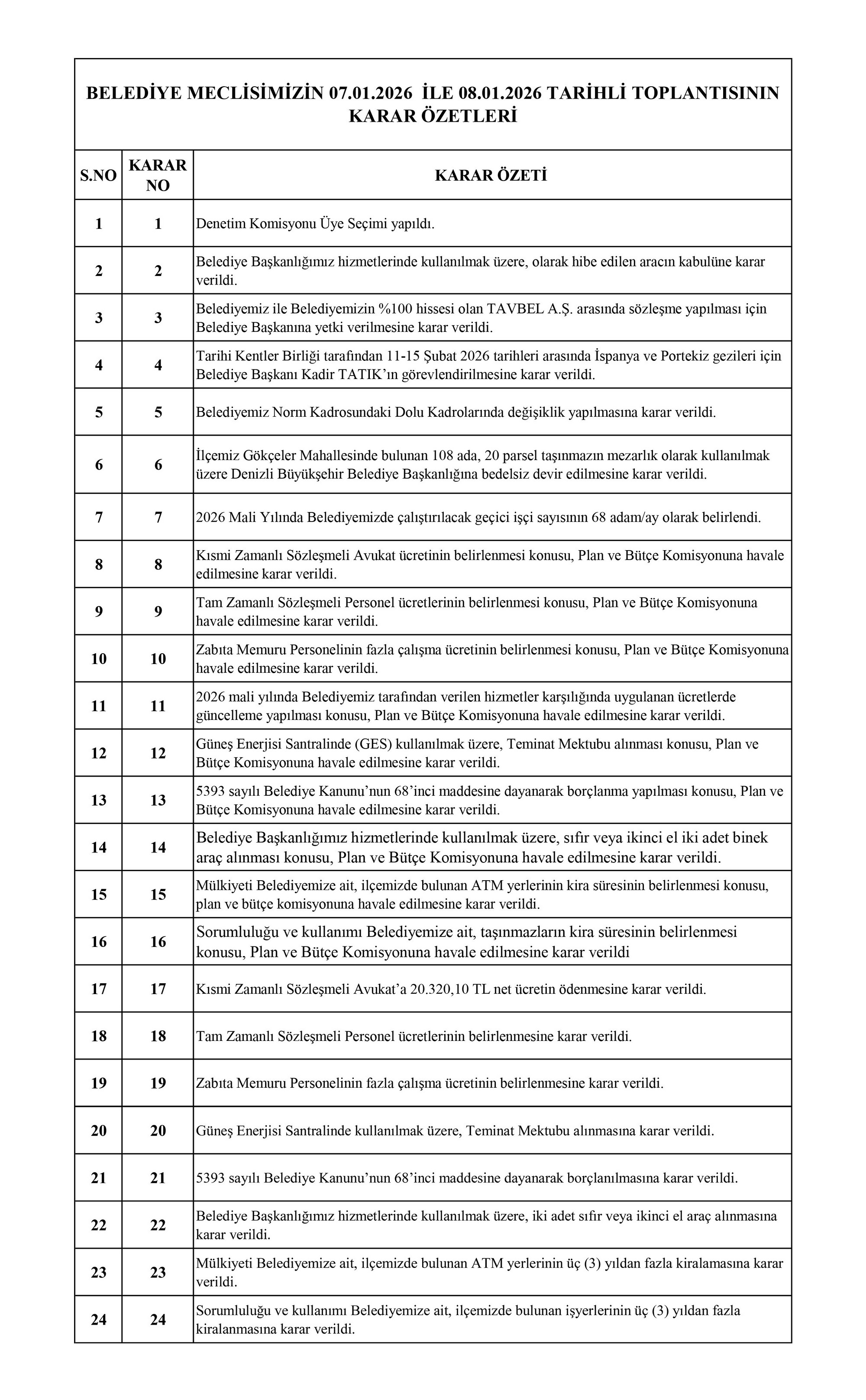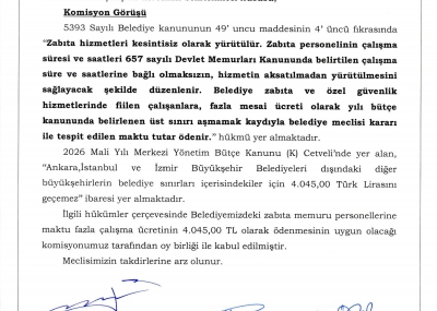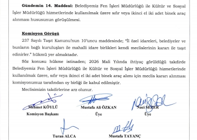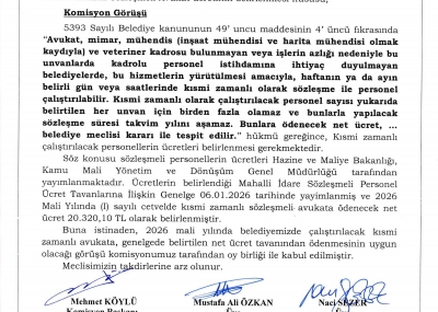 / BELEDİYE MECLİSİMİZİN 07.01.2026-08.01.2026 TARİHLİ 2026-01 NOLU TOPLANTISININ KARAR ÖZETLERİ VE İMAR İLE PLAN VE BÜTÇE KOMİSYON RAPORU