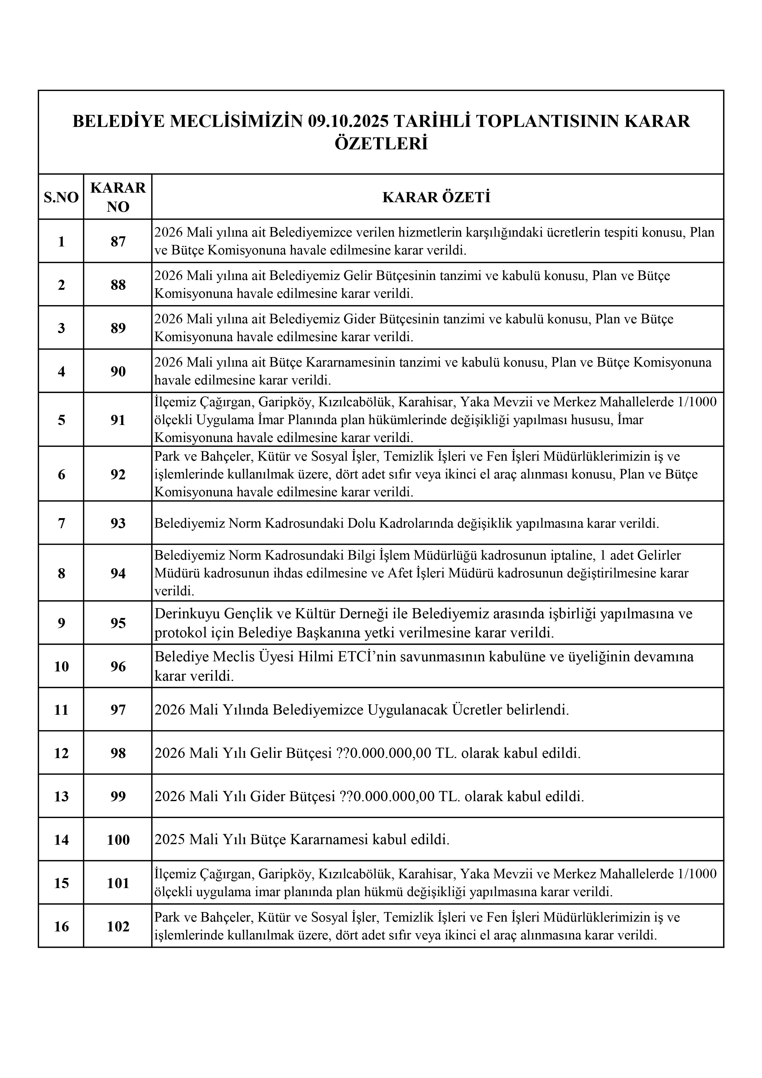 / BELEDİYE MECLİSİMİZİN 09.10.2025 TARİHLİ 2025-9 NOLU TOPLANTISININ KARAR ÖZETLERİ VE İMAR İLE PLAN VE BÜTÇE KOMİSYON RAPORU