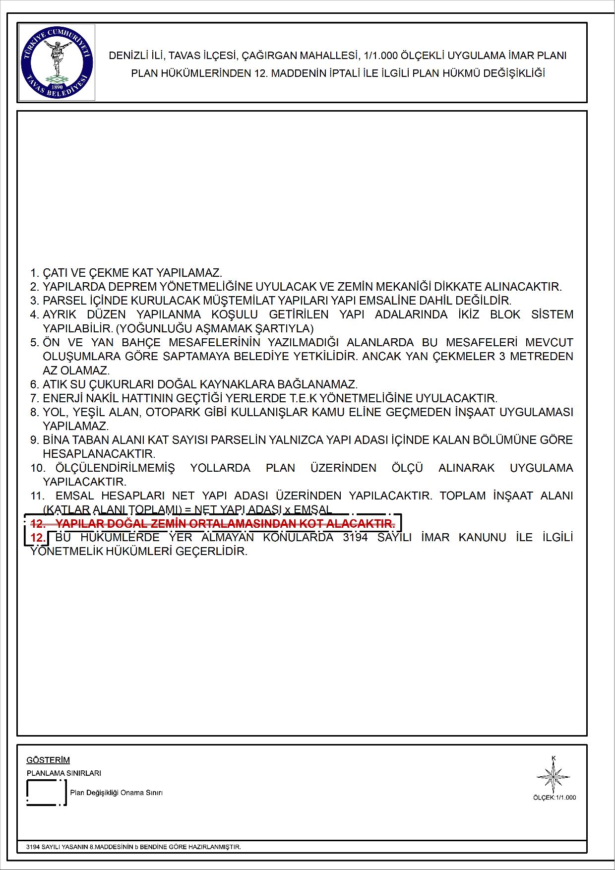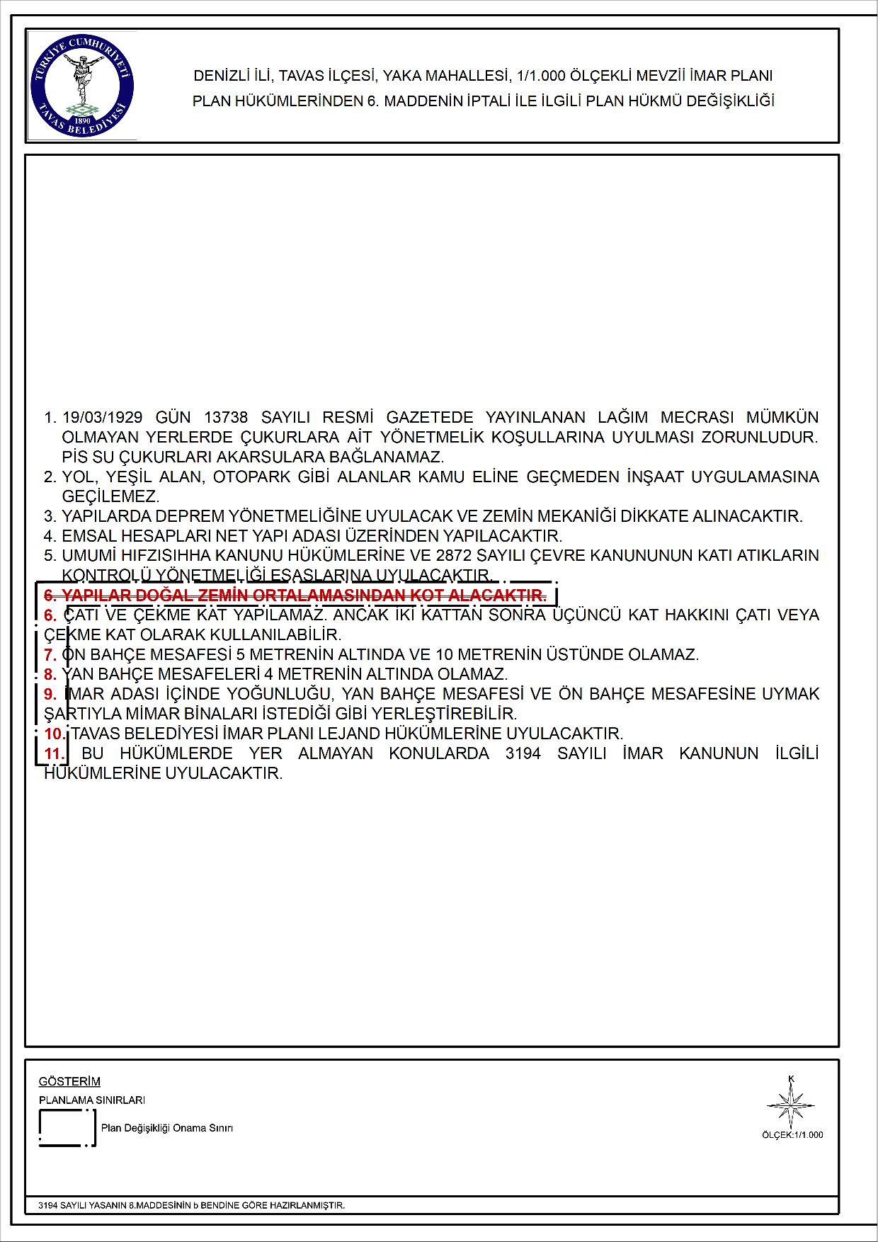 09.10.2025 tarihli ve 101 sayılı Tavas Belediyesi meclis toplantısında görüşülüp kabul edilen daha sonra Denizli Büyükşehir Belediyesi tarafından 16.10.2025 tarihli ve 764 sayılı Meclis Kararı ile onaylanan; İlçemiz Merkez, Çağırgan, Garipköy, Kızılcabölük, Karahisar ve Yaka Mahalleleri ile ilgili UİP-201107475, UİP-201107467, UİP-201107466, UİP-201107471, UİP-201107468, UİP-201107473 Plan İşlem Numaralı 1/1.000 Ölçekli Uygulama İmar Planı Plan Hükmü Değişiklikleri 18.11.2025-17.12.2025 tarihleri arasında askıya çıkarılmıştır.