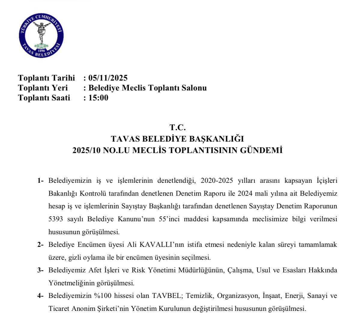 T.C. TAVAS BELEDİYE BAŞKANLIĞI 2025/10 NOLU MECLİS TOPLANTISININ GÜNDEMİ