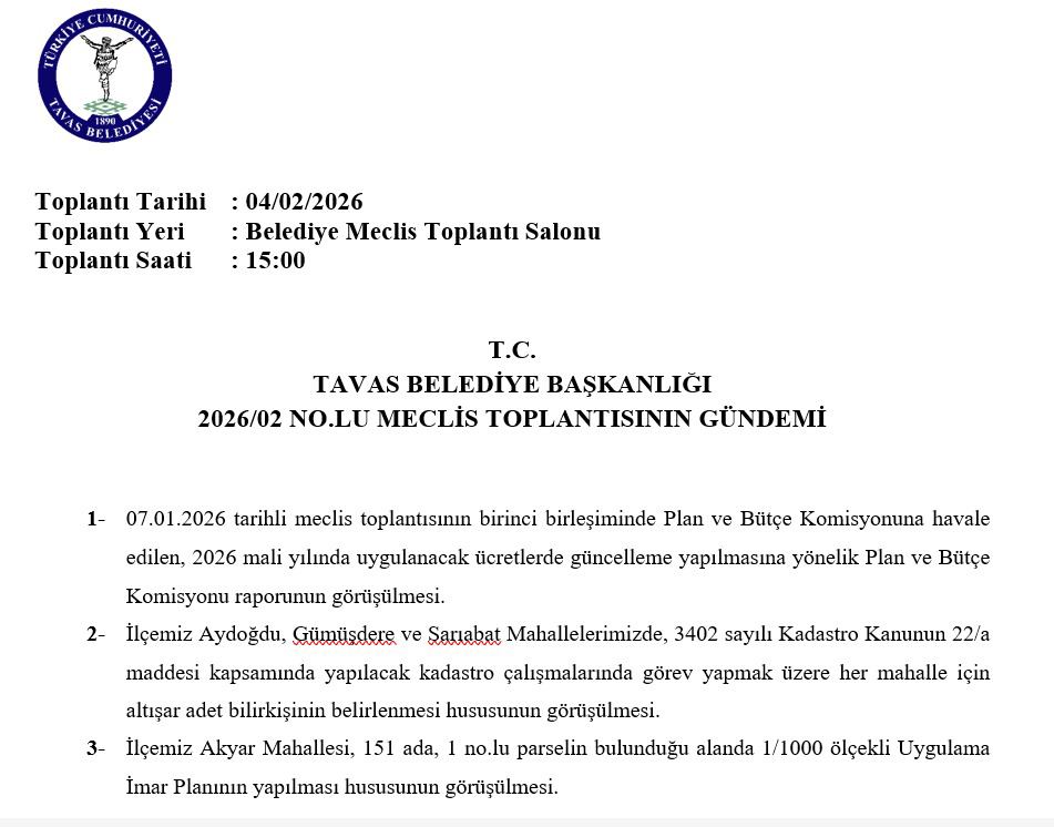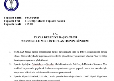 / T.C. TAVAS BELEDİYE BAŞKANLIĞI 2026/02 NOLU MECLİS TOPLANTISININ GÜNDEMİ