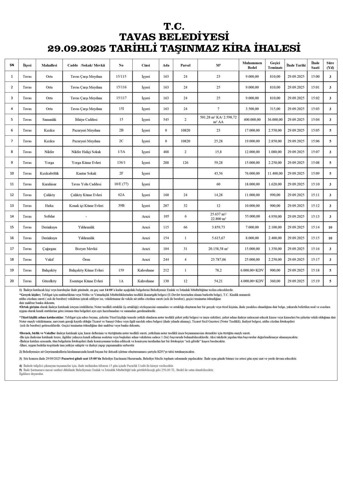 / 29.09.2025 TARİHLİ İŞYERİ, ARAZİ KİRA İHALESİ İLANI