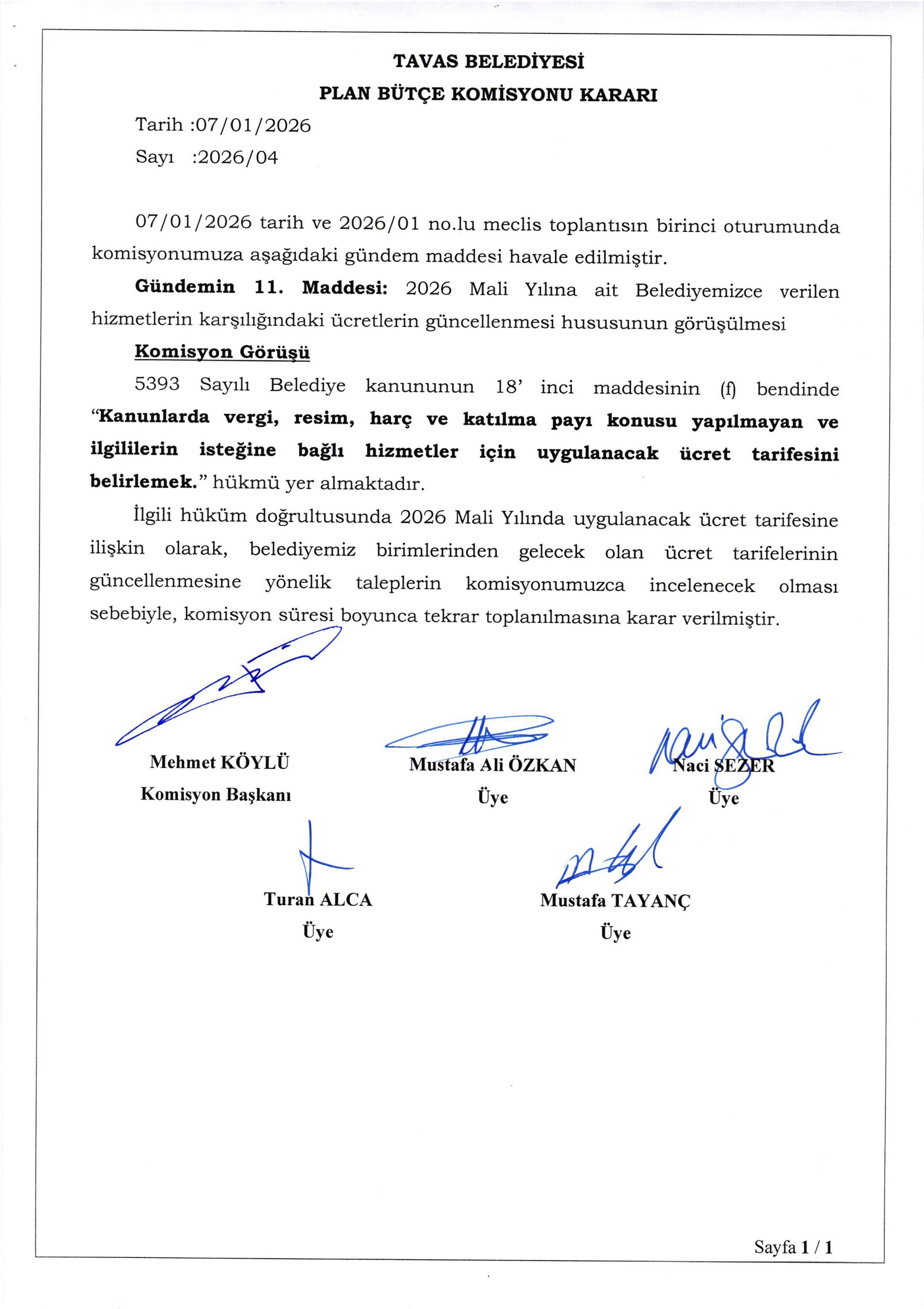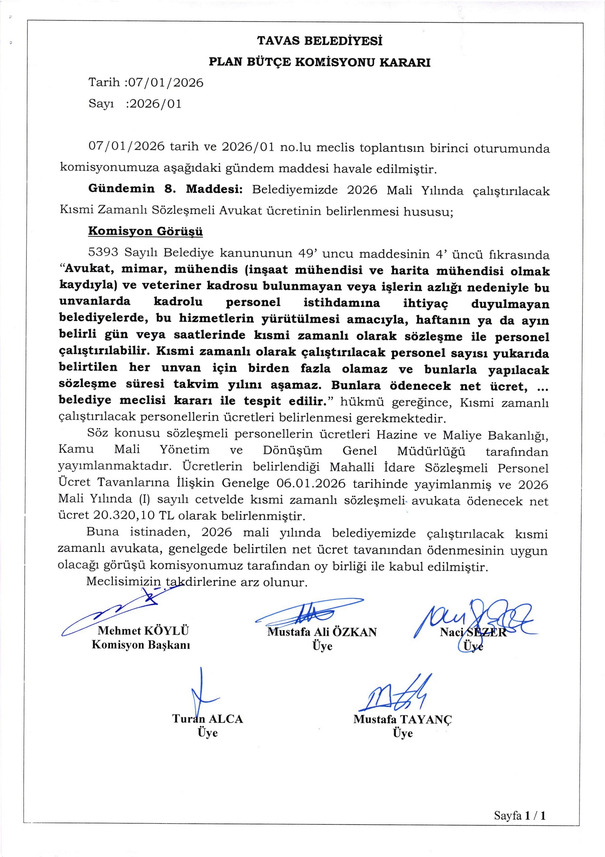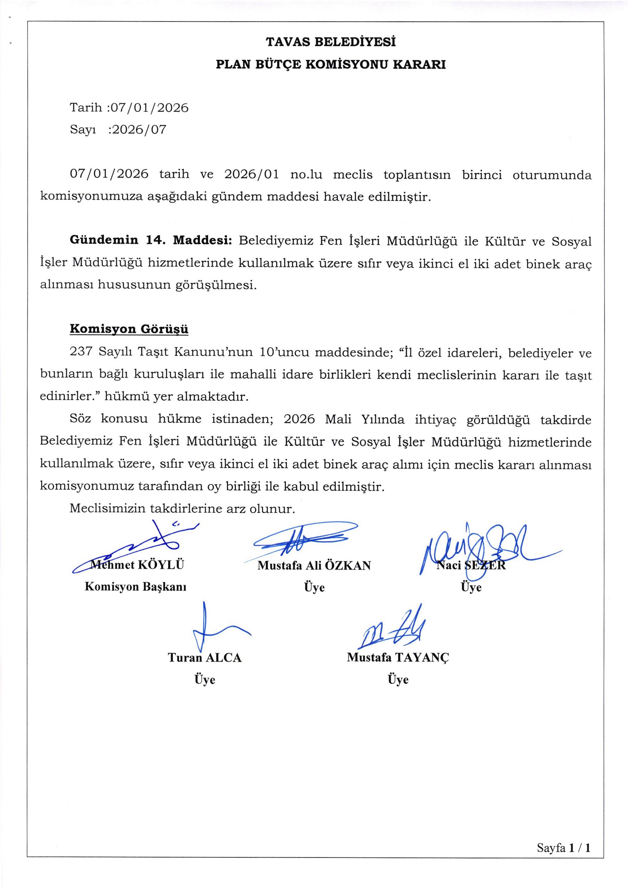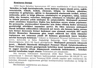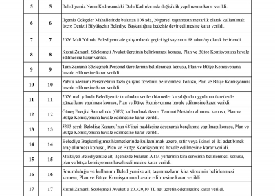 / BELEDİYE MECLİSİMİZİN 07.01.2026-08.01.2026 TARİHLİ 2026-01 NOLU TOPLANTISININ KARAR ÖZETLERİ VE İMAR İLE PLAN VE BÜTÇE KOMİSYON RAPORU