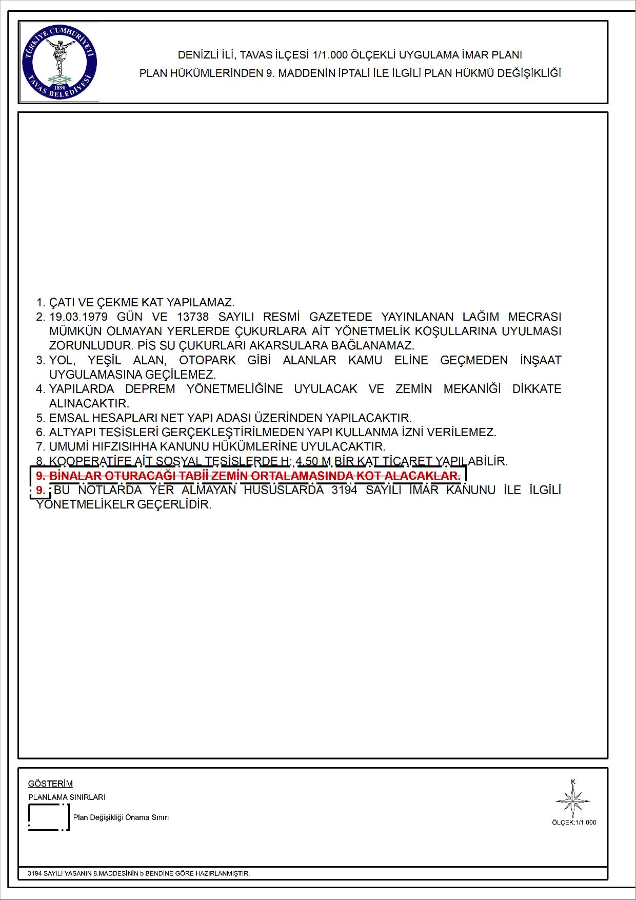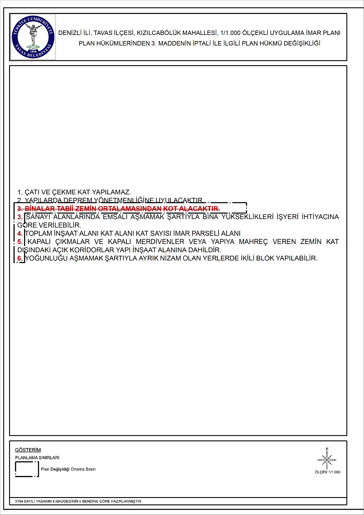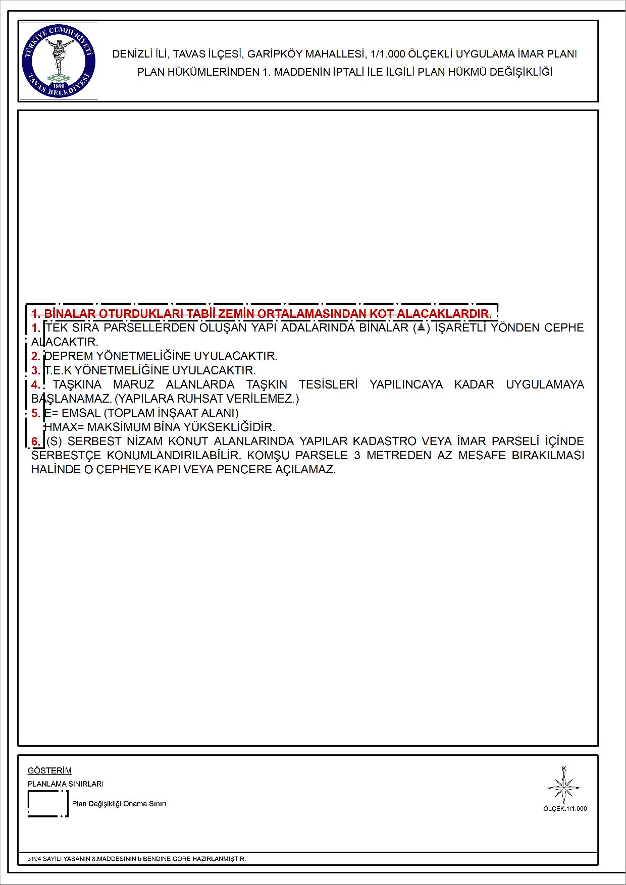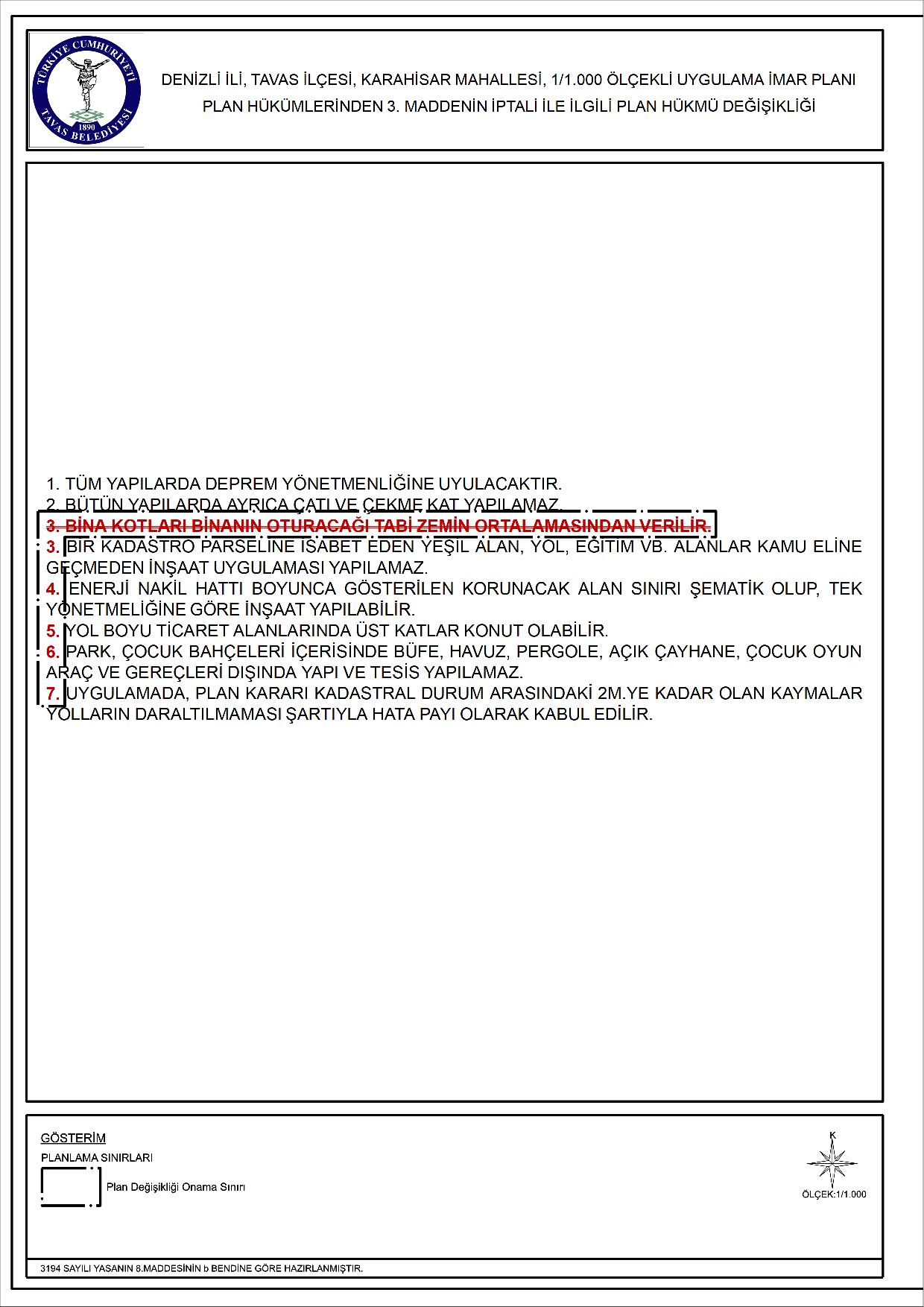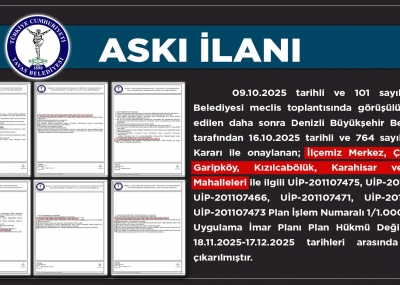 09.10.2025 tarihli ve 101 sayılı Tavas Belediyesi meclis toplantısında görüşülüp kabul edilen daha sonra Denizli Büyükşehir Belediyesi tarafından 16.10.2025 tarihli ve 764 sayılı Meclis Kararı ile onaylanan; İlçemiz Merkez, Çağırgan, Garipköy, Kızılcabölük, Karahisar ve Yaka Mahalleleri ile ilgili UİP-201107475, UİP-201107467, UİP-201107466, UİP-201107471, UİP-201107468, UİP-201107473 Plan İşlem Numaralı 1/1.000 Ölçekli Uygulama İmar Planı Plan Hükmü Değişiklikleri 18.11.2025-17.12.2025 tarihleri arasında askıya çıkarılmıştır.