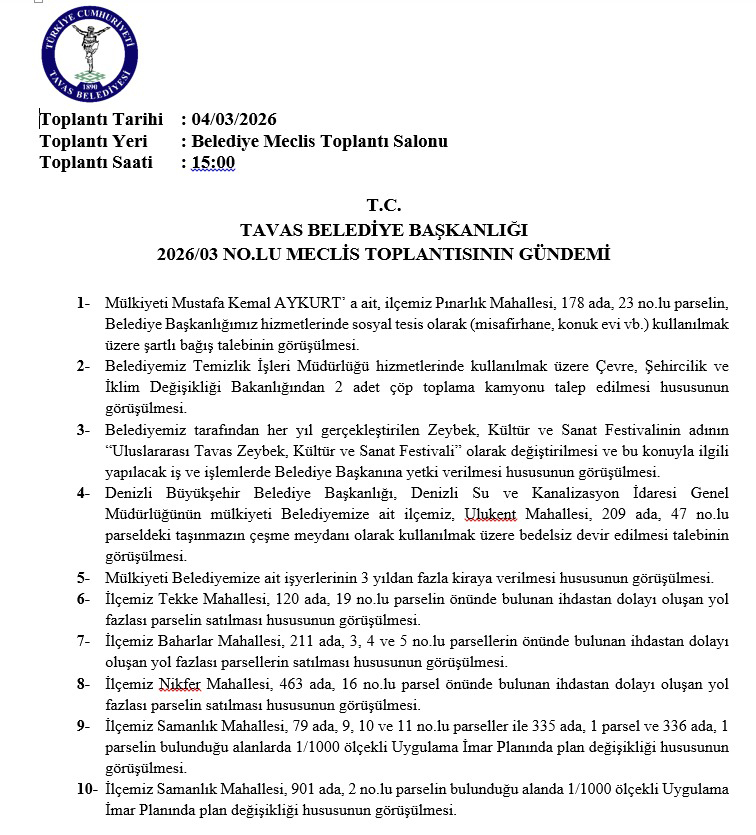 T.C. TAVAS BELEDİYE BAŞKANLIĞI 2026/03 NOLU MECLİS TOPLANTISININ GÜNDEMİ